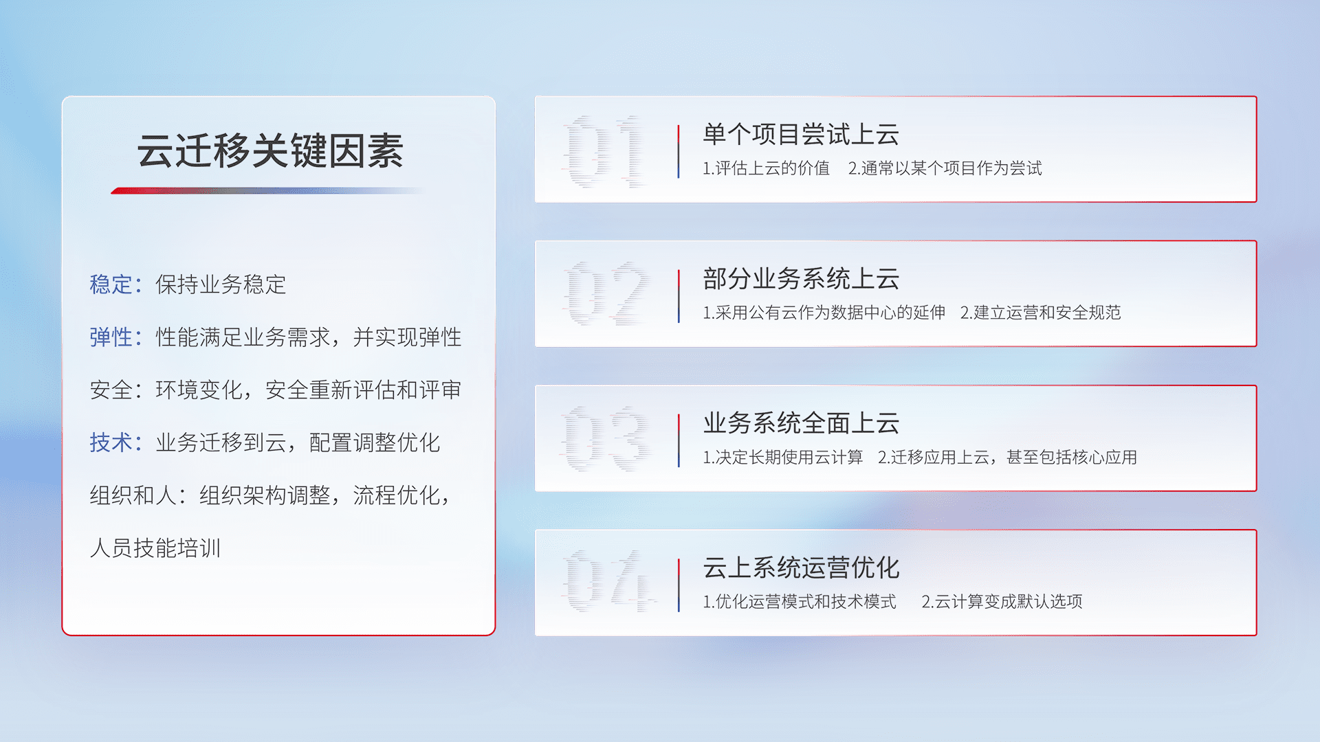 结合实际业务,,从规划设计、、、云平台选型、、、、云原生改造、、数据迁移、、集成交付,,,,迁移全过程为客户识别最佳上云路径,,,,做好风险识别管理,,设计网络架构、、身份权限、、、安全审计合规、、操作审计、、、日志审计、、、监控告警策略、、、多站点容灾设计等,,对云上基础设施进行整体规划,,,,提升IT治理水平,,,,以满足弹性、、、、高可用、、、高性能的需求。。。