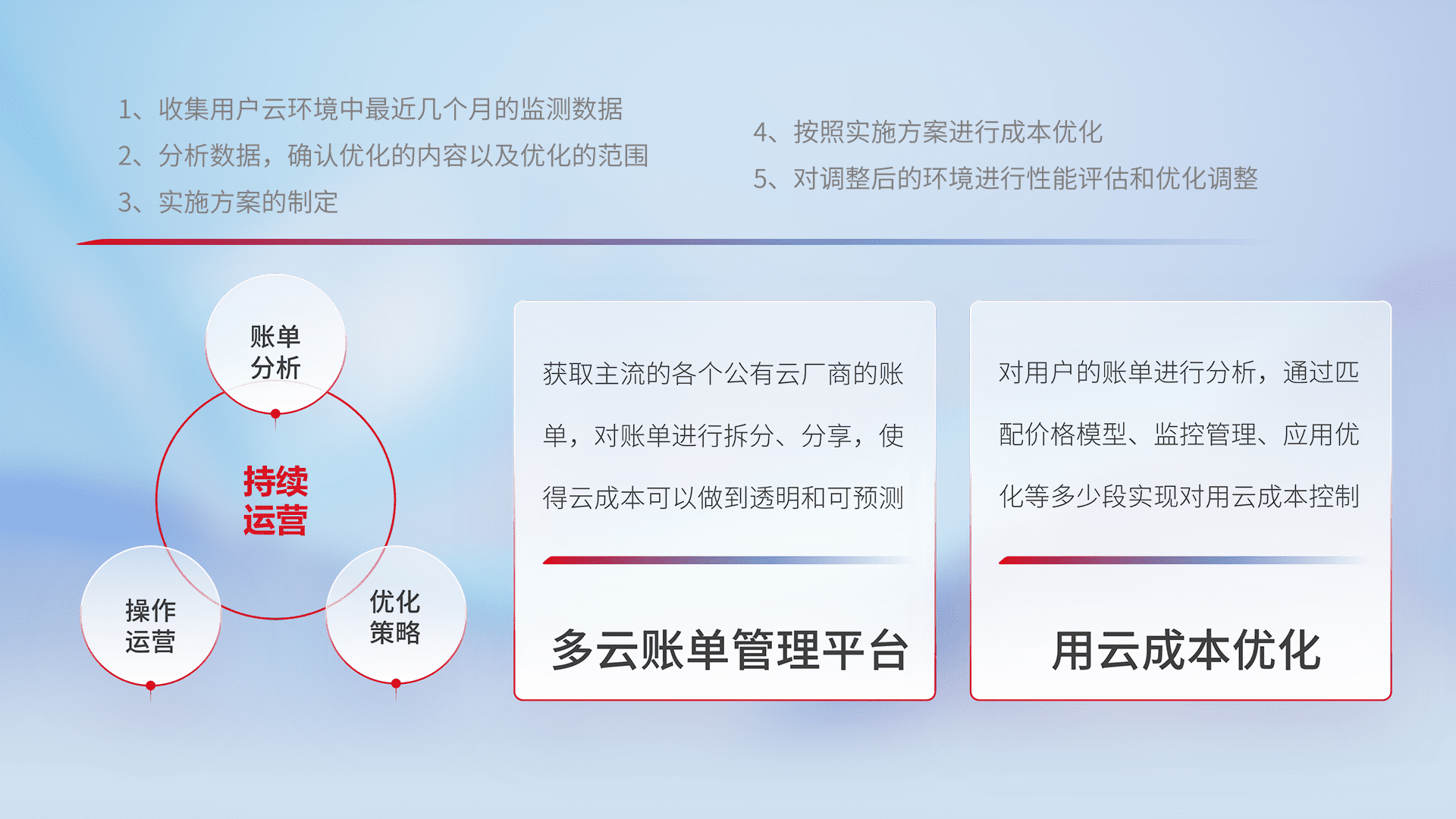 通过多云纳管,,,,以统一的资源数据模型把客户的云资源进行抽象和封装,,,,进而实现对多云资源的统一操作,,,,保障云资源管理的可靠性、、稳定性与可用性。。。。量身定制化运维内容,,配置、、、开发运维、、补丁管理、、、、备份、、、监控、、认证和访问管理、、、审计和日常巡检等,,保障在用云过程中的可靠度,,,,稳定度以及高可用率。。。