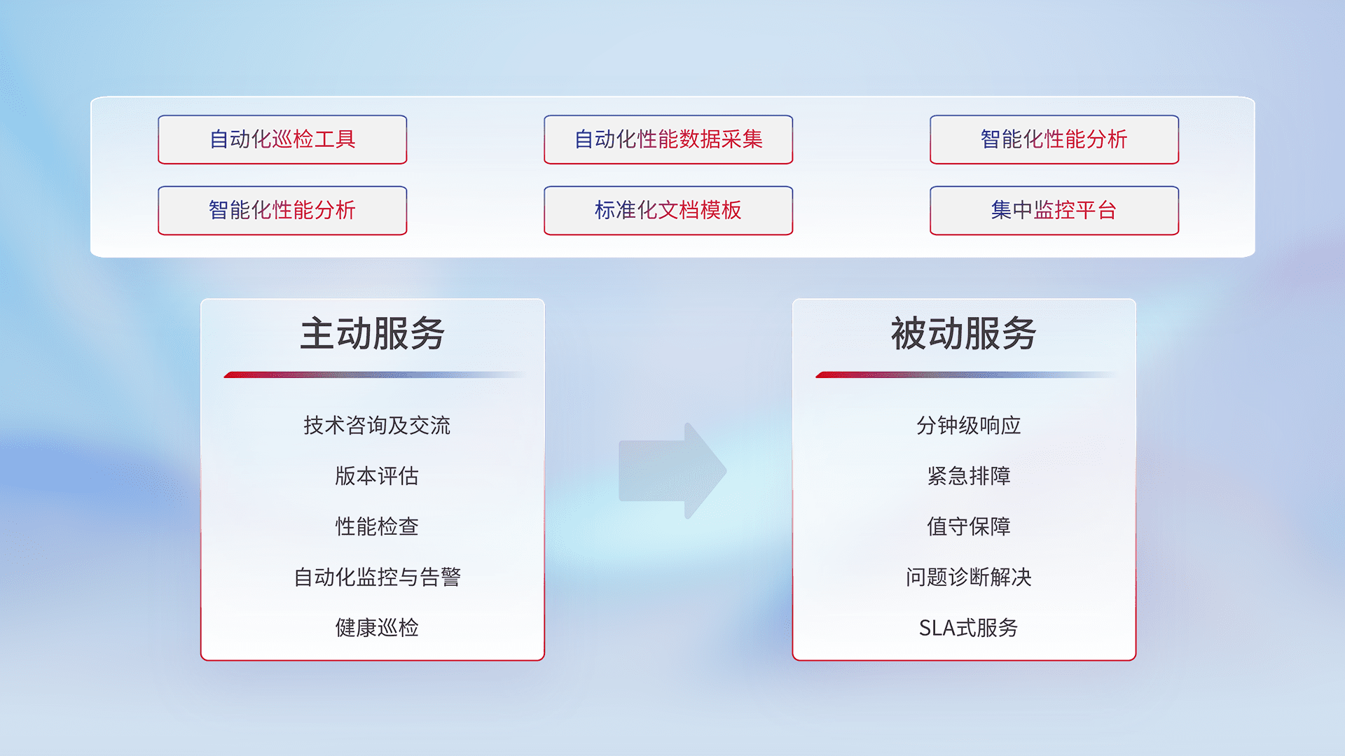 智能化工具和标准化文档,,保障服务质量,,提供主动服务(包含技术咨询、、、版本评估、、性能检查、、、自动化监控与告警、、、、健康巡检)和被动服务包含(分钟级响应、、、紧急排障、、、值守保障、、、、问题诊断解决、、、、SLA服务)。。。。